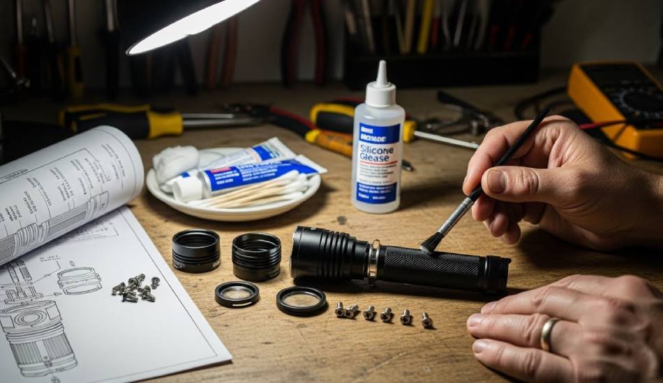 بررسی و گریس کاری اورینگ ها (برای مدل های ضدآب): اگر چراغ قوه شما ضدآب است، اورینگ های (واشر لاستیکی) آن نقش حیاتی در جلوگیری از ورود آب ایفا می کنند. به صورت دوره ای، این اورینگ ها را بررسی کنید تا مطمئن شوید پاره یا خشک نشده اند. در صورت نیاز، آنها را با مقدار کمی گریس سیلیکونی مخصوص (نه گریس نفتی) روان کنید. این سرویس و نگهداری چراغ قوه عمر قابلیت ضدآب بودن آن را تضمین می کند