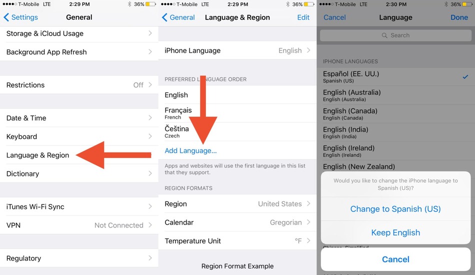 - بلافاصله پس از انتخاب زبان، یک پیام تأیید نمایش داده می شود. برای اعمال تنظیمات باید روی گزینه Change to [زبان انتخابی] ضربه بزنید.