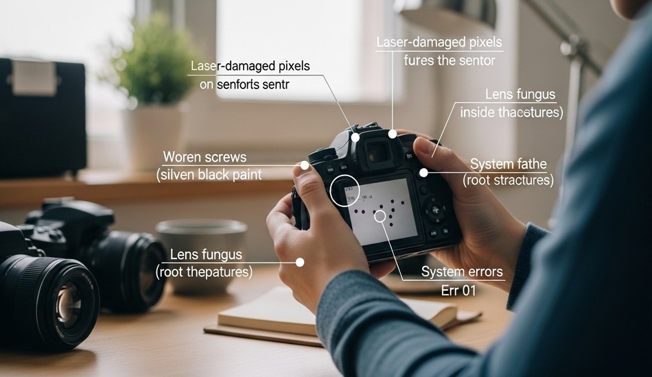 قبل از اینکه ساعتها، وقت صرف بررسی ظاهر دوربین کنید، باید بدانید چه چیزهایی «قاتل» دوربین هستند. در هر راهنمای خرید دوربین دست دوم معتبری، این موارد به عنوان خط قرمز شناخته میشوند. اگر در تست اولیه با این موارد برخورد کردید، معامله را فسخ کنید: