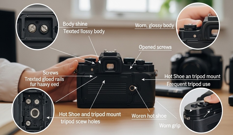 - کفشک فلاش و محل اتصال سهپایه: به قسمت زیر دوربین نگاه کنید. اگر دور سوراخ پیچ، خط و خشهای دایرهای عمیق وجود دارد، یعنی دوربین زیاد روی سهپایه بسته شده. همچنین رنگرفتگی ریلهای کفشک فلاش (Hot Shoe) نشاندهنده استفاده زیاد از فلاش اکسترنال است.