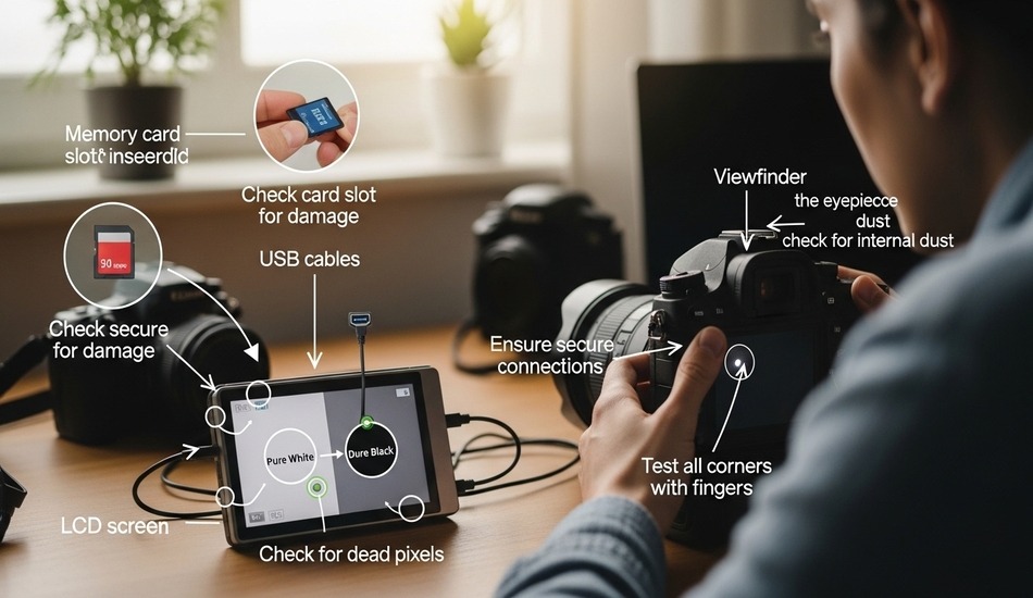 - اسلات کارت حافظه: حتماً یک کارت حافظه داخل دوربین بگذارید. چند عکس بگیرید و همان جا در دوربین بازبینی (Playback) کنید. پینهای داخل جای کارت حافظه (مخصوصاً مدلهای CF) بسیار حساساند و با ضربه کج میشوند.